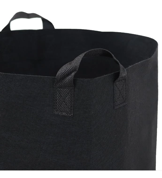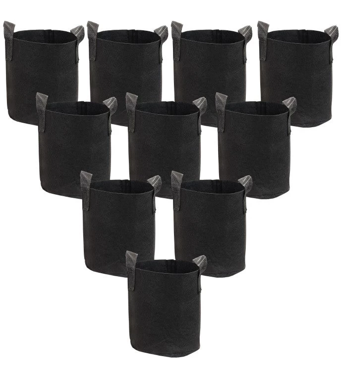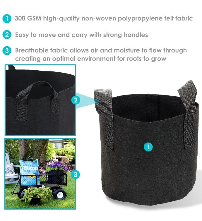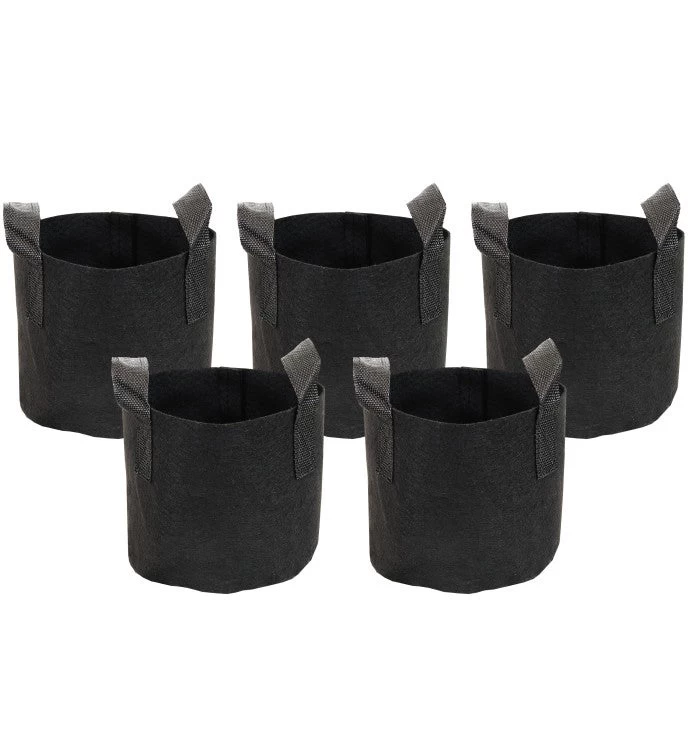 Heavy-duty garden grow bags with durable handles. Made of nonwoven 300 GSM needle punched polypropylene felt. Includes 5 grow bags. Easy to move and provides excellent drainage for healthier plants and roots