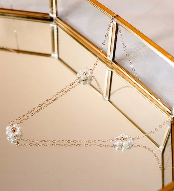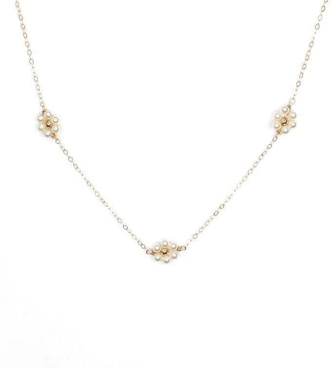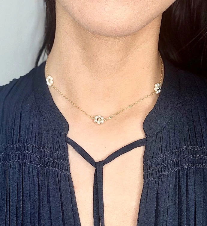 Elegant 14K gold filled choker featuring three handmade daisies. The daisies consist of six 3mm Swarovski cream pearls and a gold filled center bead. The choker length is 14-16″. Made by Herself Collections in NYC Herself Collections is a women owned online jewelry boutique where women can feel confident in purchasing high quality pieces, that are nearly all handmade, but also modern, sleek, and beautiful.