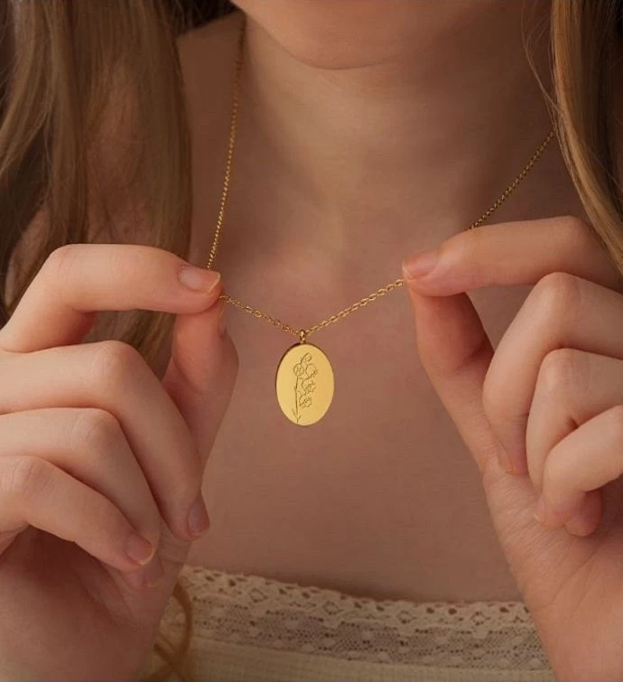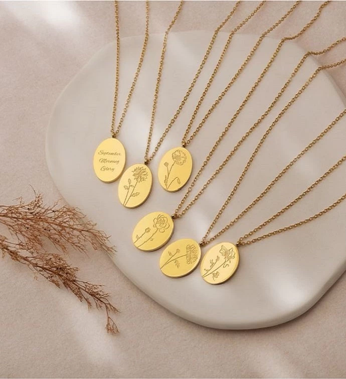 The lovely 18k gold oval pendant features a lovely engraving of a birth flower on the front and the month and flower name on the back.