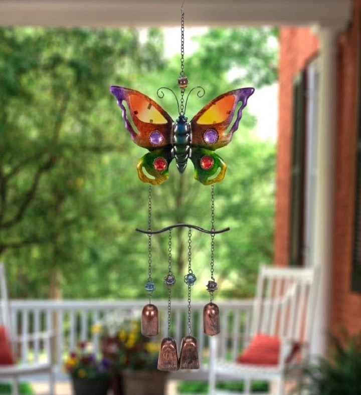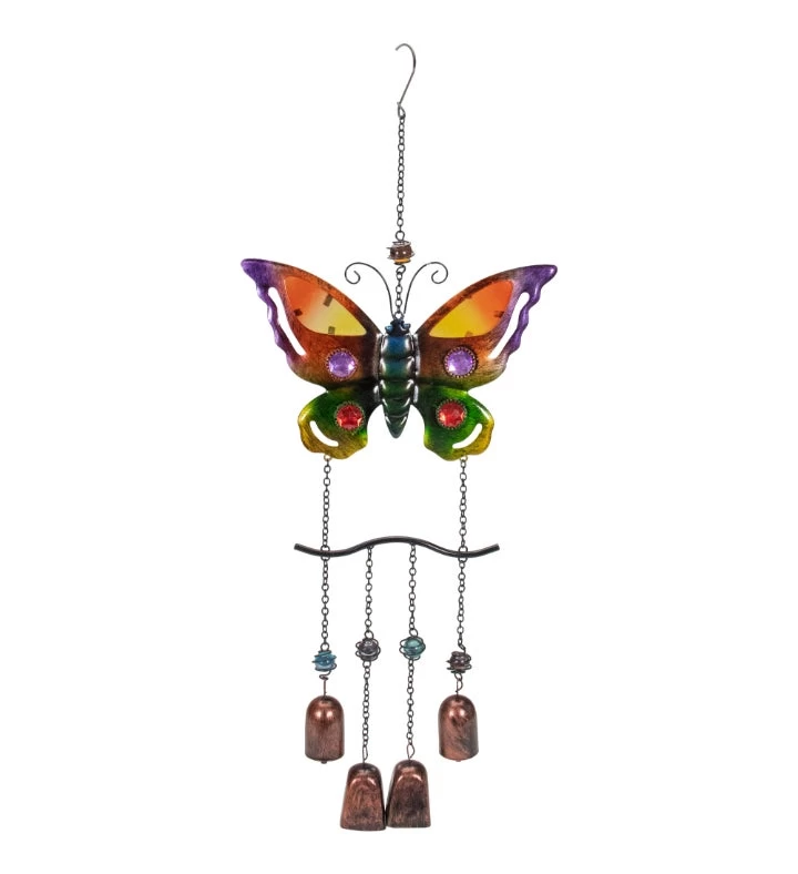 Butterfly outdoor windchime. Embellished with faux jewels. 4 hanging bell chimes. Easy to hang from metal chain with hook. For outdoor use. Dimensions: 24″H x 9″W x 1.25″D. Material(s): metal/plastic