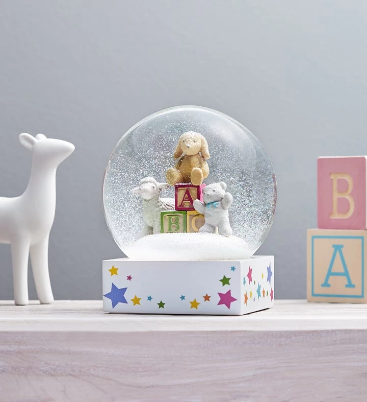 - Glass snow globe filled with water that magnifies objects inside; features lamb, bear and dog figurines perched on three ABC blocks with stars all around and iridescent snow/glitter