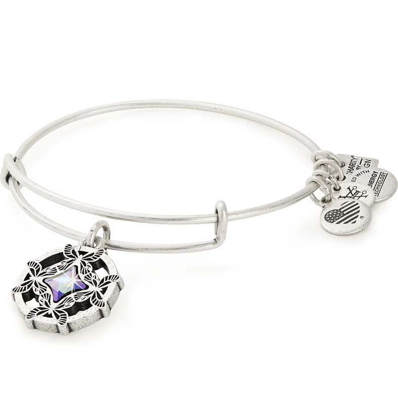 Before becoming their true selves, butterflies undergo periods of transformation. Our Wings of Change bangle from Alex and Ani is a special symbol of that process. Finished in polished Rafaelian silver, it’s adorned with a butterfly charm, accented by colorful Swarovski® crystal in the center. Arriving with its own meaning card, this inspirational piece will encourage someone you care about to spread their wings and soar.