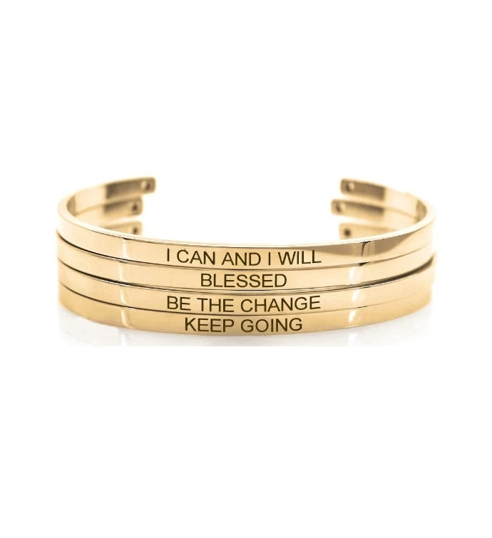 Style your hand with beautiful stainless steel stackable cuff bangles. The bangle comes high polished, star cut out at both ends, and laser engraved with a motivational quote. Worried about the size? Don’t! Bangles can be stretched and adjusted to fit any size wrist.