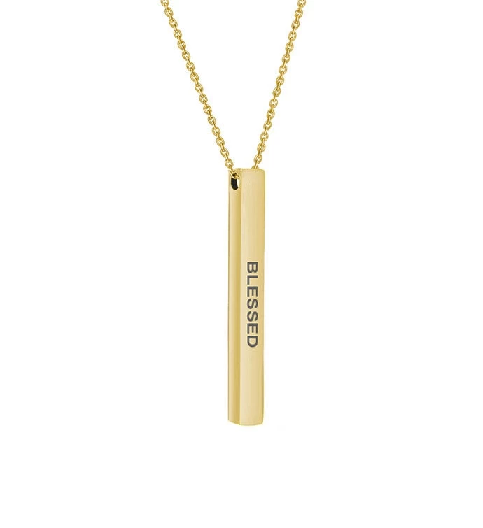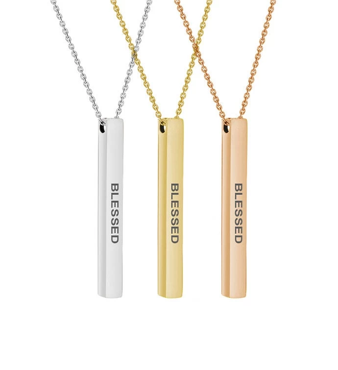 High quality polished stainless steel bar engraved with beautiful motivational and inspirational quotes that can brighten your day once you read it. The 3-D attention grabbing bar necklace can be layered with other dainty necklaces or worn independently.
