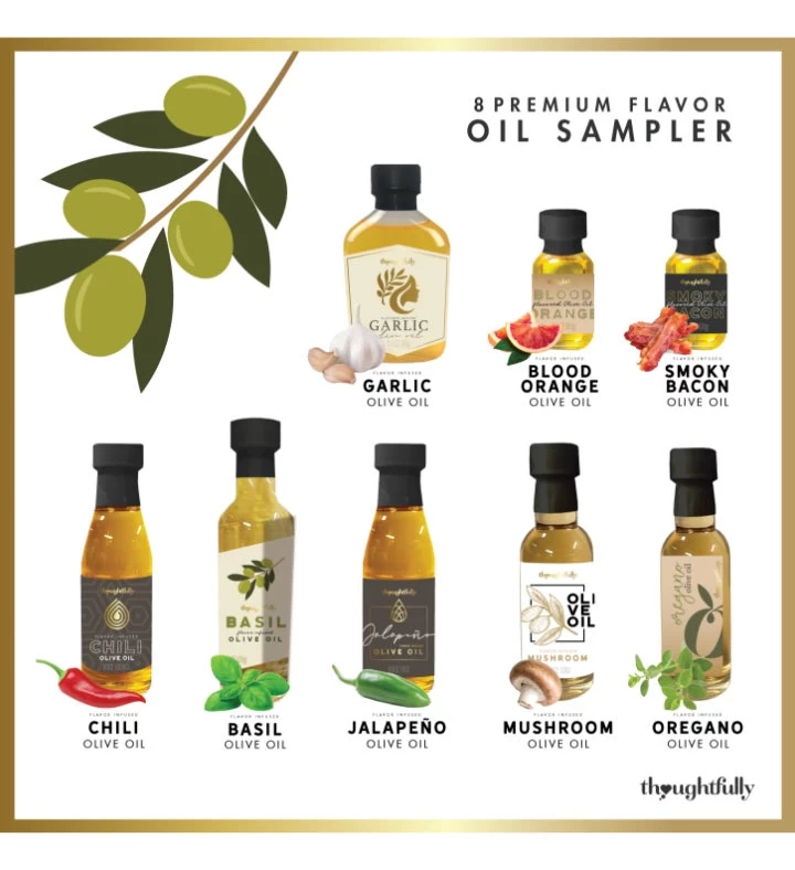Includes 8 flavored olive oils in glass bottles, ranging from 0.85 oz. – 2 fl. oz. Flavors include garlic, chili, smoky bacon, mushroom, jalapeno, blood orange, oregano and basil. Try in recipes, dips, sauces, & dressings.