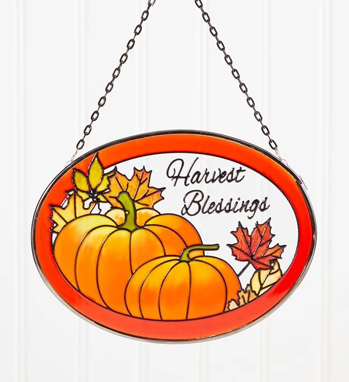 - Exclusive pumpkin suncatcher welcomes the arrival of fall; made from genuine stained glass to reflect natural sunlight and features the sentiment “Harvest Blessings”‘; includes silver chain hanger; measures 5″H x 7″W