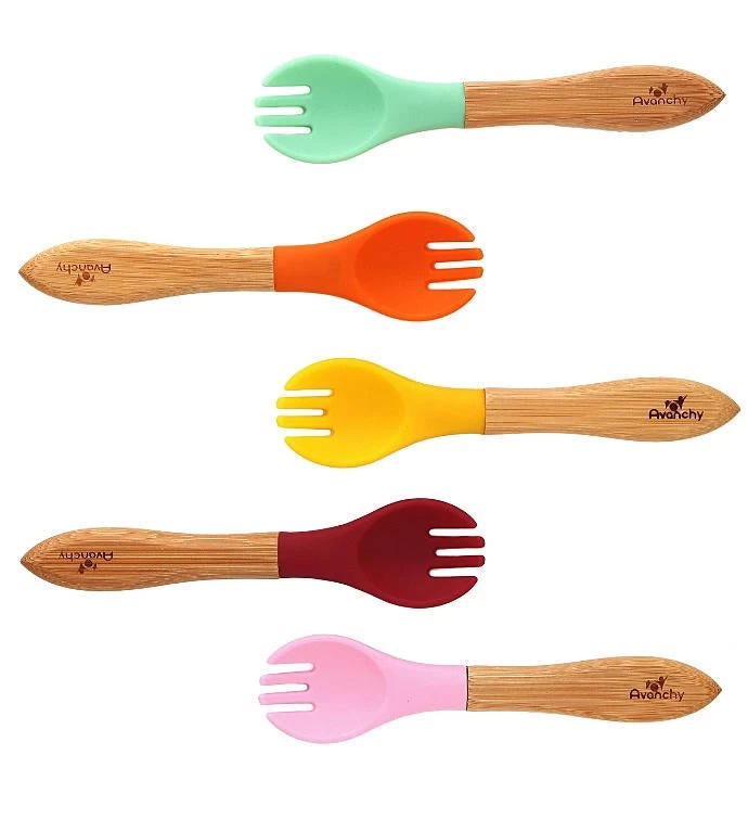 Forks are crafted of organic bamboo and silicone. FDA-approved food-grade varnish. Training fork has larger head and shorter handle which is easier for older babies to hold. Training fork has a reinforced Silicone body which allows your little one to practice piercing basic foods. A great baby or toddler Training fork for baby Lead Weaning (BLW)