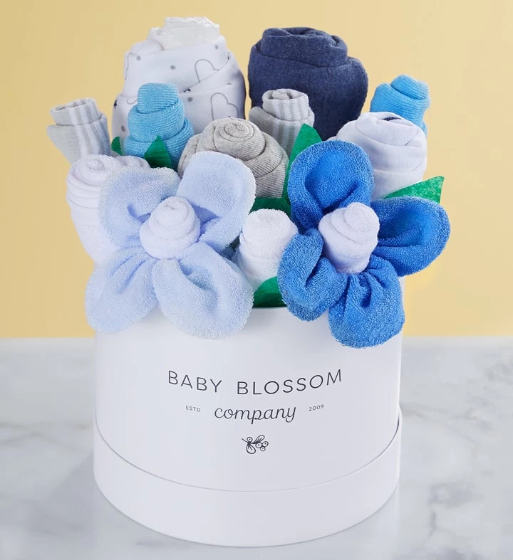 EXCLUSIVE Celebrate their growing family with our sweet keepsake gift set from Baby Blossom. This adorable “bouquet”—exclusively created for 1-800-Flowers—blooms with a selection of baby essentials to welcome their little one. Hand-arranged in a charming hat box, and available in pink, blue or yellow, it’s a unique and practical surprise for the proud new parents.