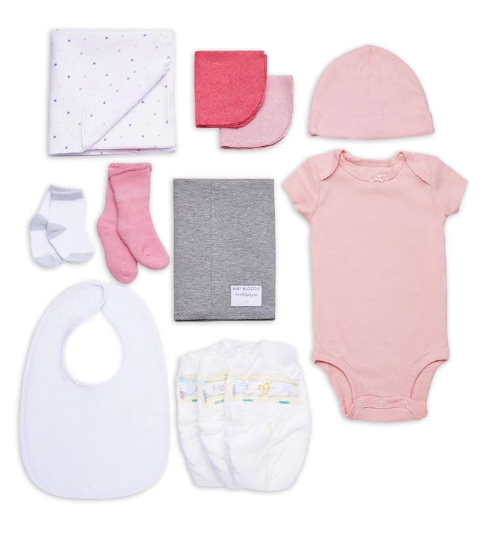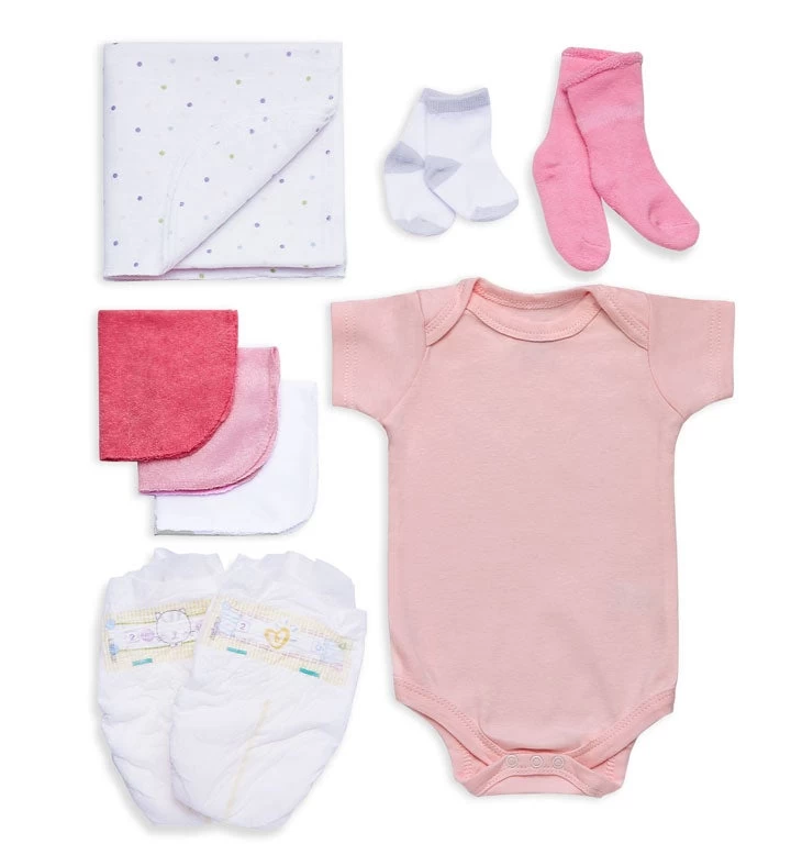 - Includes 1 bodysuit, 3 washcloths, 3 pairs of socks, 2 disposable Pampers diapers wrapped in a flannel receiving blanket