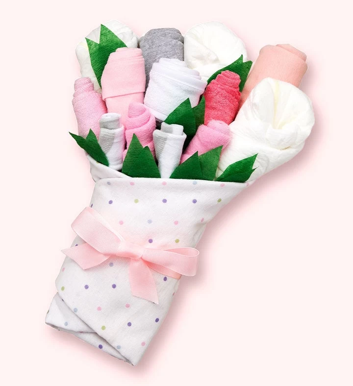 Welcome a little one with our bundle of love. This pink-themed layette of new baby essentials includes washcloths, socks, a bodysuit and more—all wrapped in a soft flannel receiving blanket and tied with a bow to resemble a sweet bouquet of blooms.