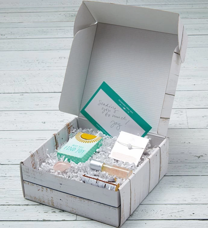 Send someone special a box of inspiration and joy on their birthday! This gorgeous gift box is happiness, inspiration and mindful in one box. Send joy to friends and family with a gift that has long-lasting impact. This beautiful gift box includes: – The May You Find Joy mini intention setting card deck. This deck of 42 cards inspires us to see the joy within us and around us every day. – A faux birch bark card stand – A rose quartz crystal for energy clearing & to promote self-love. – An intention thread bracelet. – A gorgeous rose quartz essential oil rollerball. This is joyful blend of lavender, orange and frankincense. This gift in enclosed in a cardboard, distressed wood box with a colorful sticker. Spread joy to someone in your life!
