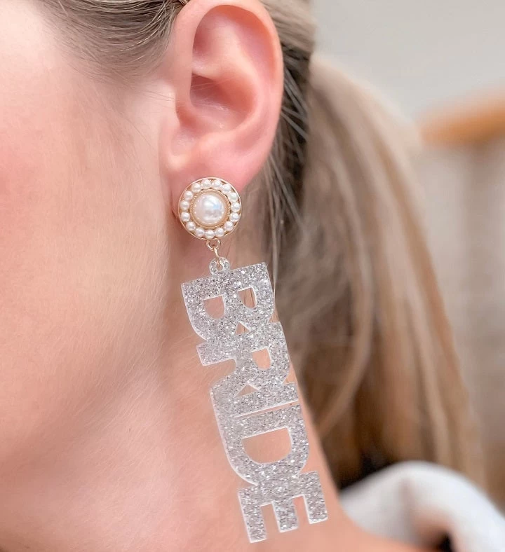 | Pick Your Item | 'bride' Acrylic Silver Glitter Dangle Earrings |