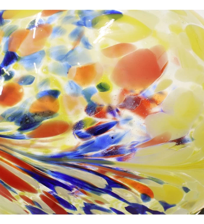 Outdoor gazing ball. Made of glass. Includes 1 gazing ball. Beautiful glass with a splash of blue, red, and yellow. Features a stemmed bottom with a rubber cap. 10″ Diameter x 11.75″ H; 2 lbs