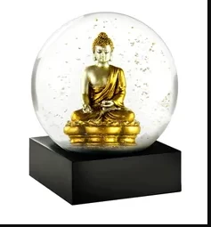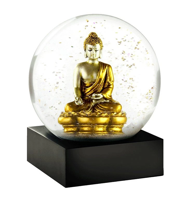 - Glass snow globe filled with water that magnifies objects inside; features a hand-painted gold Buddha sculpture sitting on a lotus flower, along with glittery gold snow that fills the globe when shaken