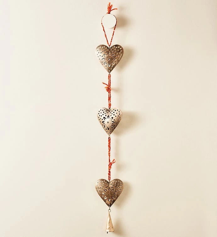 This hanging bell chime features a cone shaped bell and a trio of cascading hearts with floral cutout designs. Upcycled textile colors cannot be chosen.