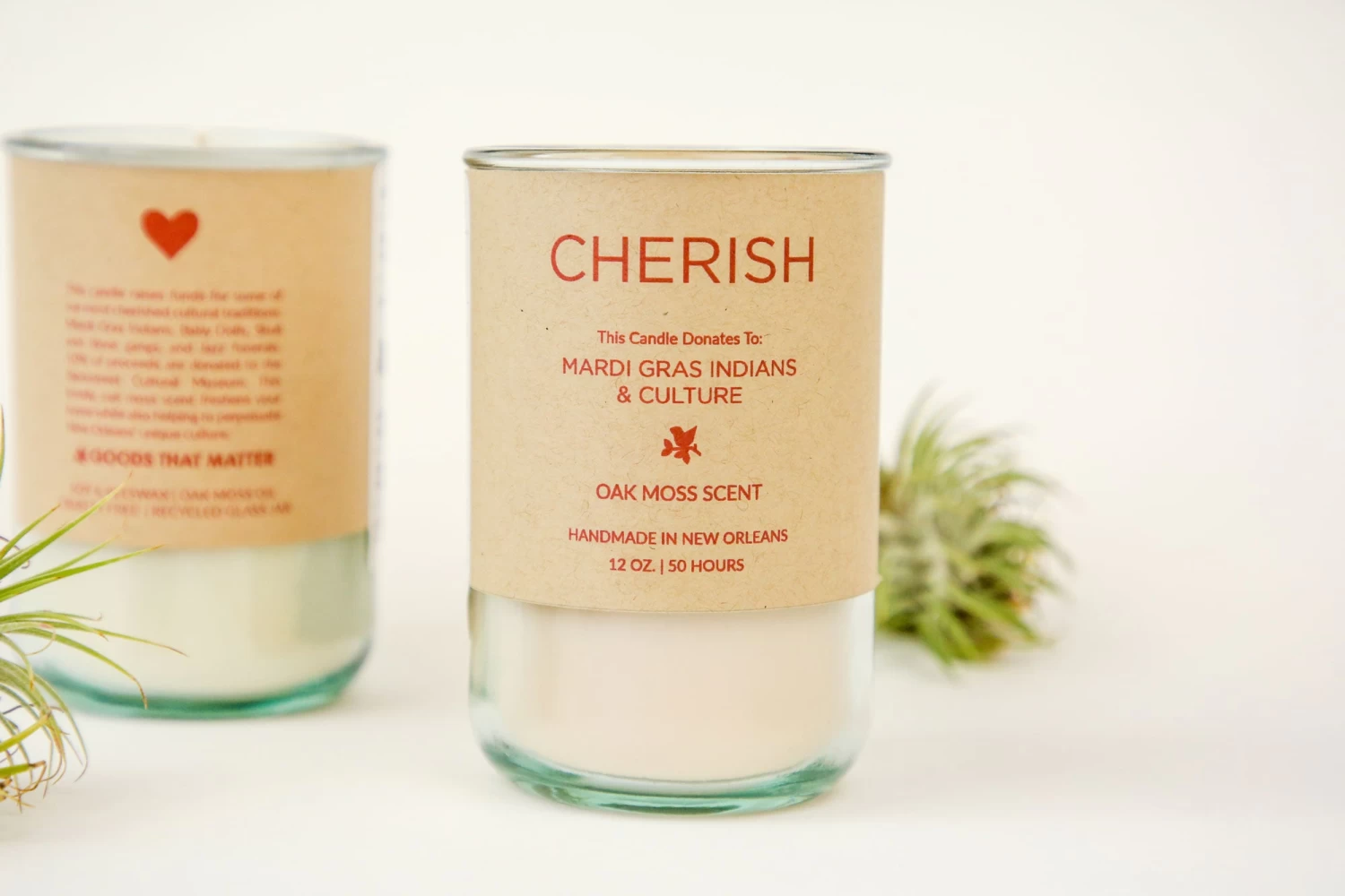 Handpoured local beeswax and soy candle in a recycled glass jar, Oak Moss scent gives back to Mardi Gras Indians & Culture