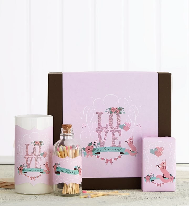 EXCLUSIVE Spark the love with our Valentine’s gift set. Features a cherry blossom-scented candle and soap (along with matches), all designed with charming pink woodland artwork and a “Love Is All You Need” sentiment. Designed in a decorative, coordinating gift box, this special collection is the perfect surprise for your sweetheart.