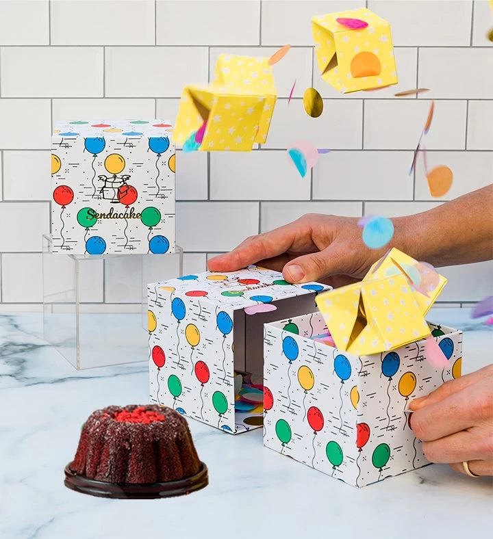 Our new Confetti Pop Box is the perfect way to celebrate your loved ones! The reusable cubes inside launch a shower of confetti before revealing a delicious Red Velvet cake.