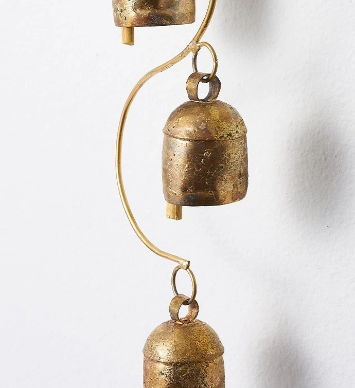 Wind chime featuring a trio of small, handmade bells for indoor or outdoor patio display. Patina and natural weathering is expected. Fair Trade. Purchases support community development.