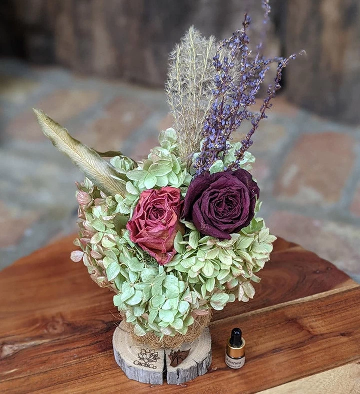 Naturally Preserved Dry Flowers: Roses, Hydrangeas, Sola flowers and Grasses.