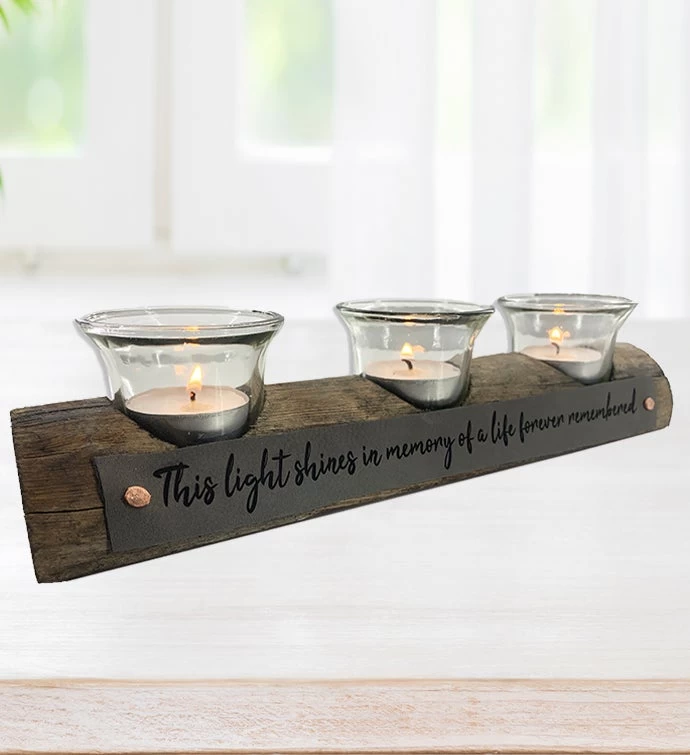 This lovely driftwood trio candleholder makes a beautiful memorial gift. The leather engraved message “This light shines in memory of a life forever remembered” is attached by copper metal nails for a lovely rustic finish.
