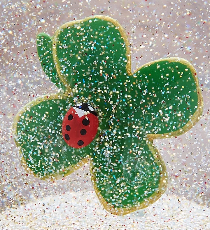 - Glass snow globe filled with water that magnifies objects inside; features a four-leaf clover with a ladybug and water droplet, along with glittery gold snow that fills the globe when shaken