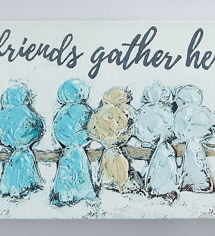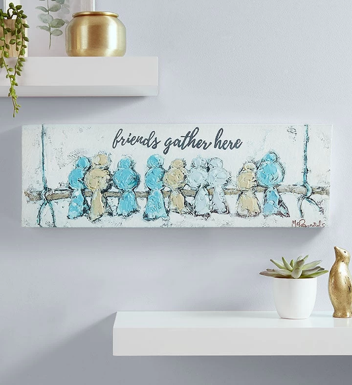 - Canvas wall art by artist Lisa McReynolds features painted birds and the sentiment “Friends Gather Here”
