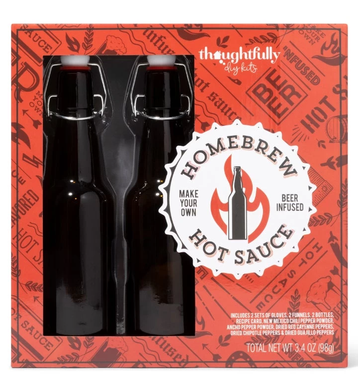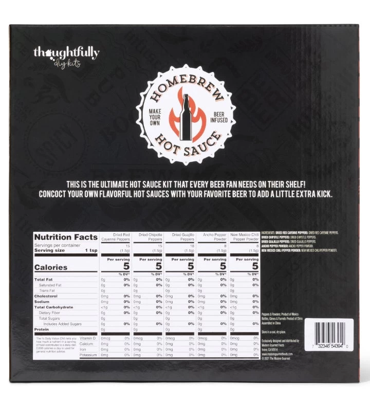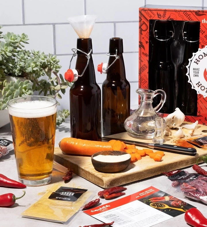 This beer infused, vegan DIY hot sauce kit lets you control the mix, so you create the flavor and the fire that’s your heart’s desire. And did we mention€¦ there’s beer in it (not included)! Each kit comes with a range of peppers, ingredients and tools to get started plus a recipe card with our two favorite mixes: American Lager Hot Sauce and Amber Ale Hot Sauce. Just add your own favorite beer. And now that you’re an expert, it’s time to experiment with the number of peppers and additional ingredients you add to achieve your desired hot sauce rank of mild, medium, hot or total fire. Just don’t forget to name your bottle before you put it out on the table. This kit is perfect for hot sauce and beer lovers who are looking to get creative in the kitchen. A unique birthday gift idea!