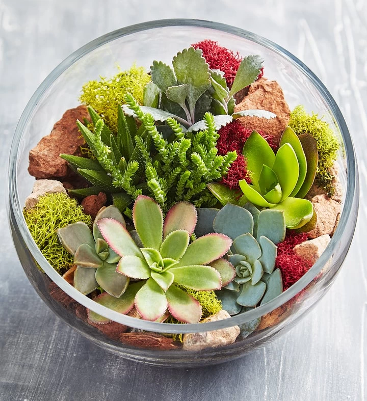 - Arrives assembled and ready to display in a round glass terrarium; measures 7″H x 8″D