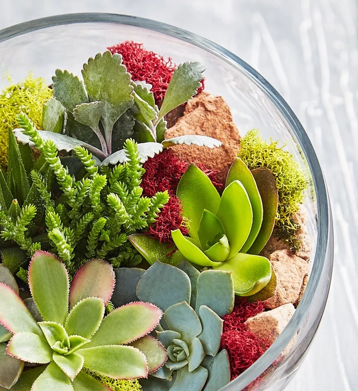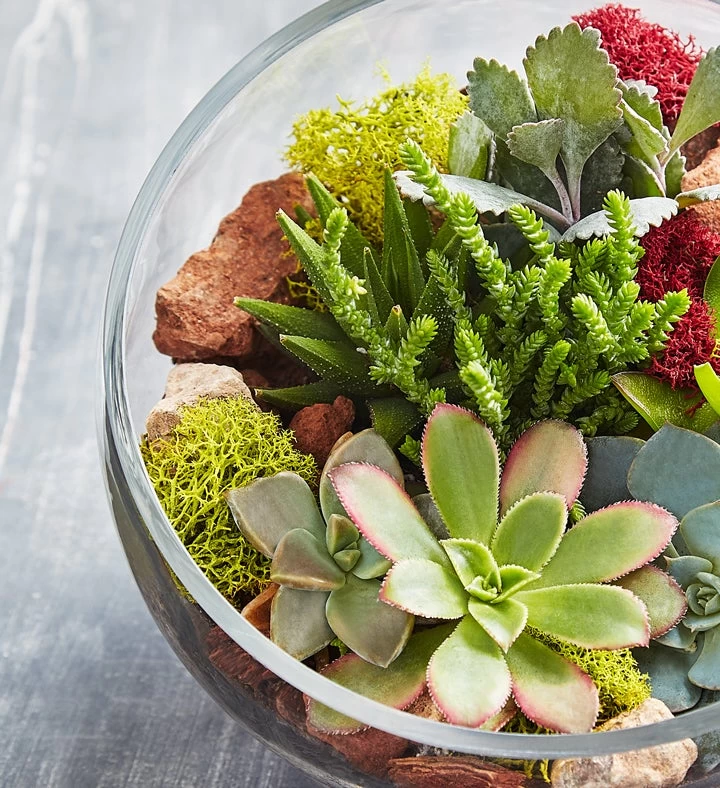 On trend and easy to maintain, our succulents are a unique and delightful way to bring lush pops of nature to any décor. Our delightful glass terrarium features an assortment of succulent varieties and includes decorative moss and rock details. Give one as a gift to someone special – including yourself!