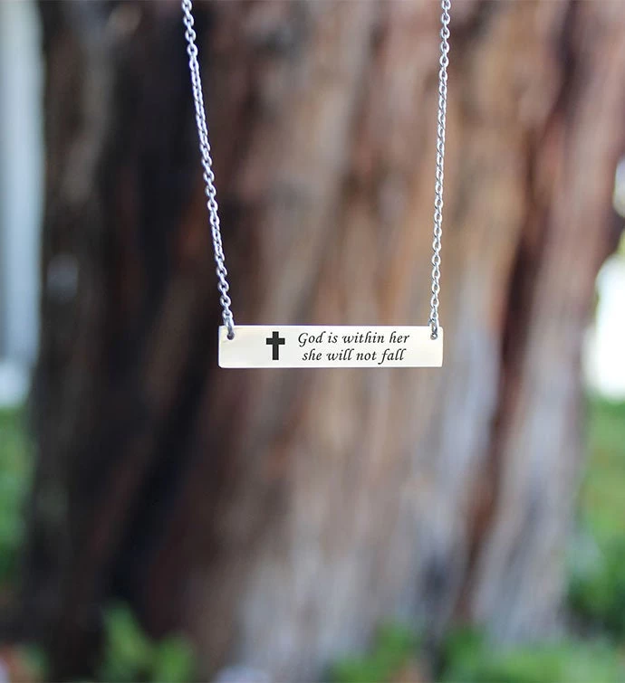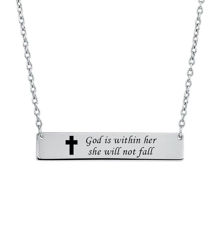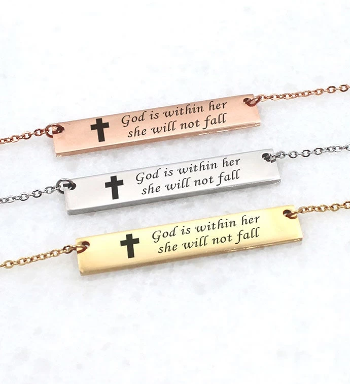 Grab everybody’s attention with the famous stainless steel bar necklace, with a twist. The bar necklace comes engraved on the front with “God is within her she will not fall” and packed in a gift box.