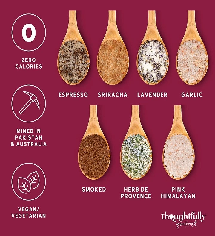This curated collection of Himalayan and Australian salts is a must-have for anyone who loves seasoning salt. Perfect for preparing or finishing your favorite dish, the seven salt blends in this salt collection are Pink Himalayan Salt, Herbes De Provence Salt, Lavender Salt, Espresso Salt, Siracha Salt, Garlic Salt, and Smoked Salt. Each artisan salt comes in a plastic tube and is packaged as a salt gift set for foodie friends and family members.This curated collection of Himalayan and Australian salts is a must-have for anyone who loves seasoning salt. Perfect for preparing or finishing your favorite dish, the seven salt blends in this salt collection are Pink Himalayan Salt, Herbes De Provence Salt, Lavender Salt, Espresso Salt, Siracha Salt, Garlic Salt, and Smoked Salt. Each artisan salt comes in a plastic tube and is packaged as a salt gift set for foodie friends and family members.
