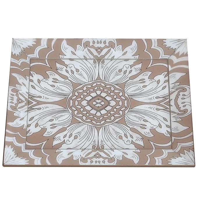 This special reverse-painted mirror tray is a luxurious addition to entryway tables, ottomans, kitchen islands, or table tops.