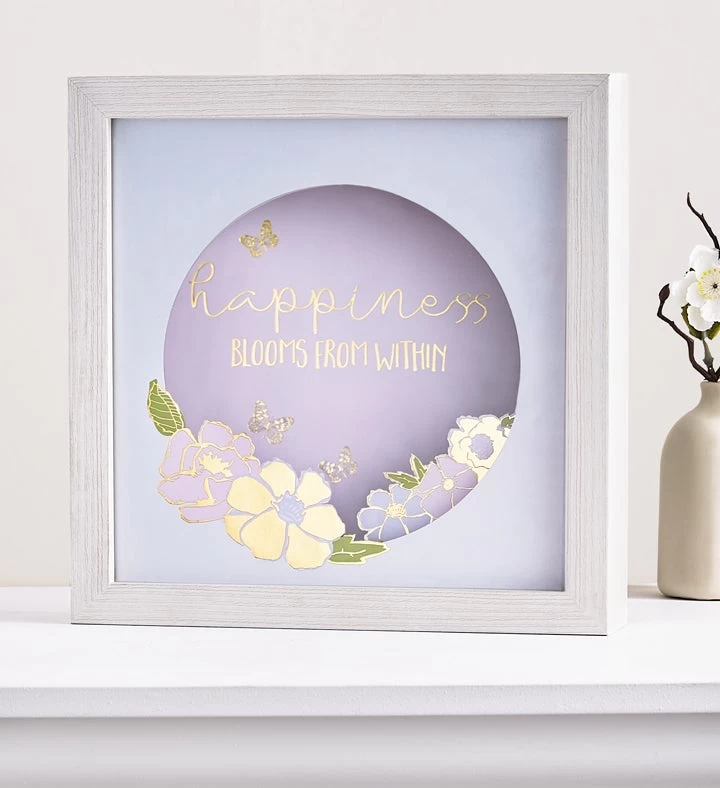 Celebrate inner strength and beauty with our inspiring gift set. The shadow box features a floral & butterfly motif and the uplifting sentiment âHappiness blooms from within,â perfect for displaying cherished mementos.
