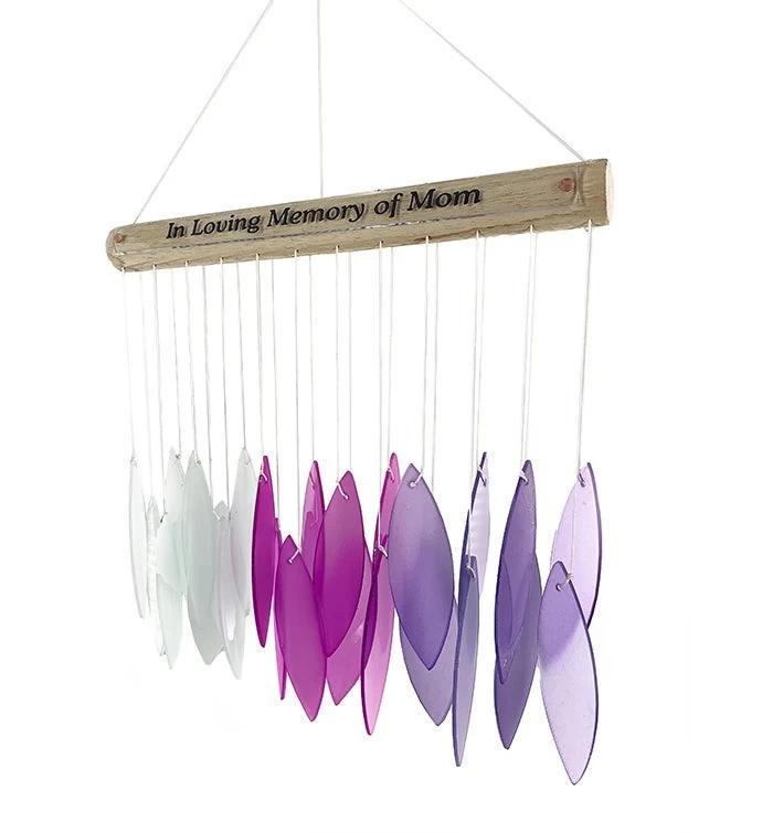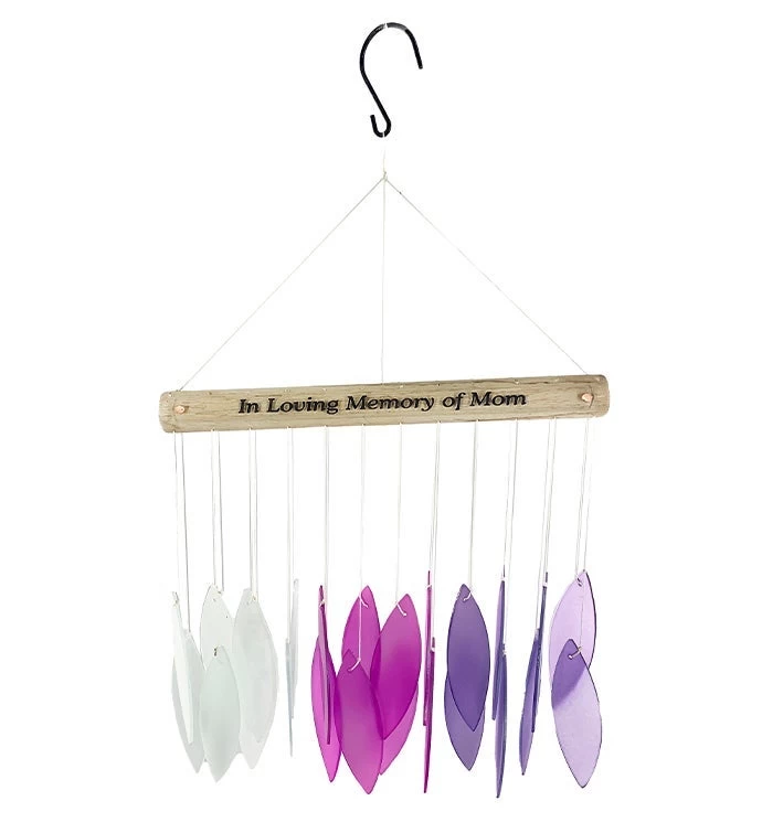 Comes beautifully gift wrapped for direct gift giving. Suitable for indoors or outdoors. Natural driftwood with hues of purples and white colored stained glass sun catchers. Reads: “In Loving Memory of Mom”.