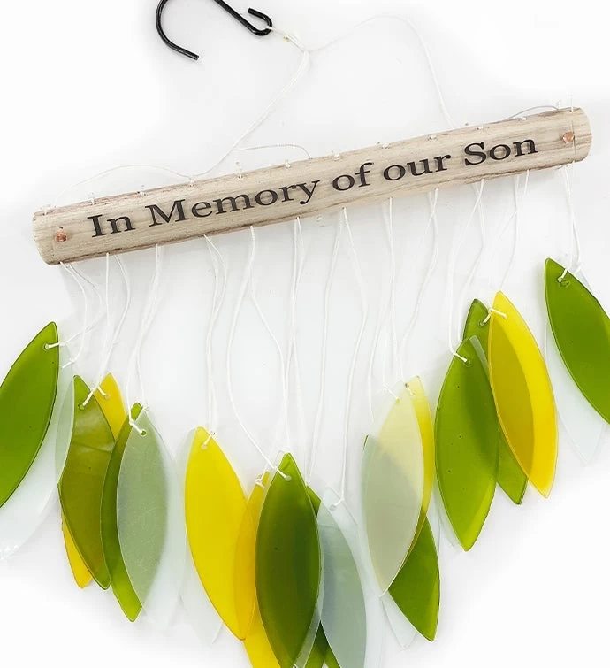 Comes beautifully gift wrapped for direct gift giving. Suitable for indoors or outdoors. Natural driftwood with hues of green, gold and white colored stained glass sun catchers. Reads: “In Memory of our Son”.