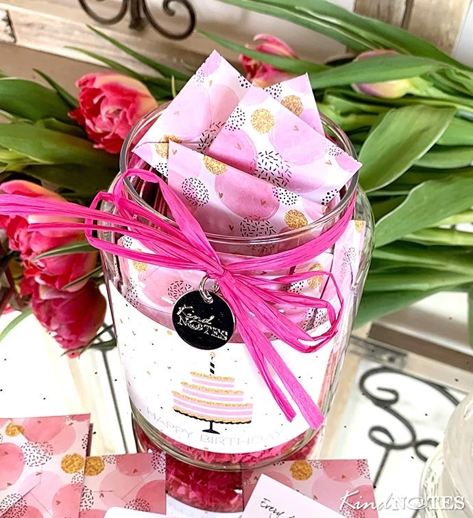 The best birthday gift to send is a jar full of happy birthday cards. This is the perfect gift to send to your long distance friends and family or give to your co-workers. Your 31 birthday notes are tucked into linen cardstock envelopes and artfully arranged in a keepsake quality glass jar adorned with balloons and a satin ribbon. Your recipient can read their cards all at once, once a day, or anytime they need a smile. A thoughtful birthday gift for anyone.