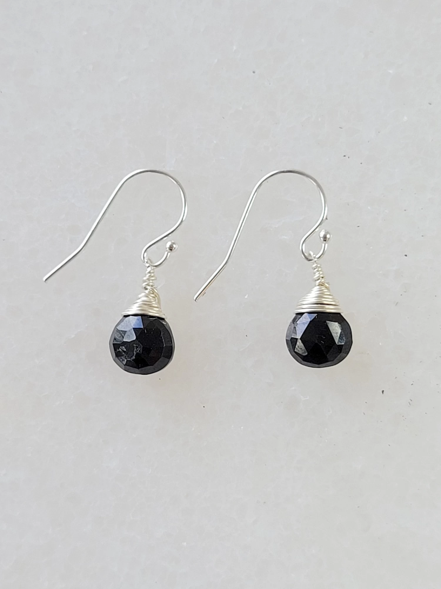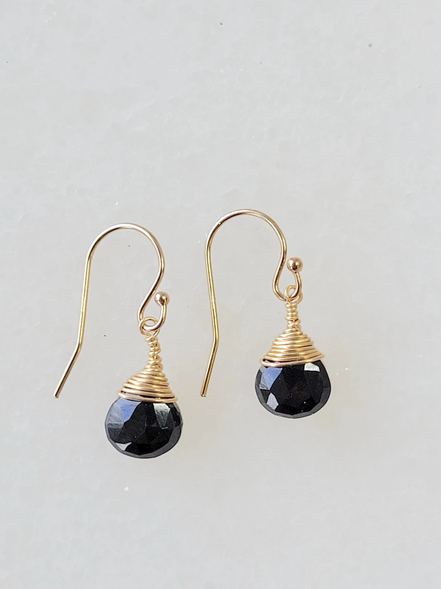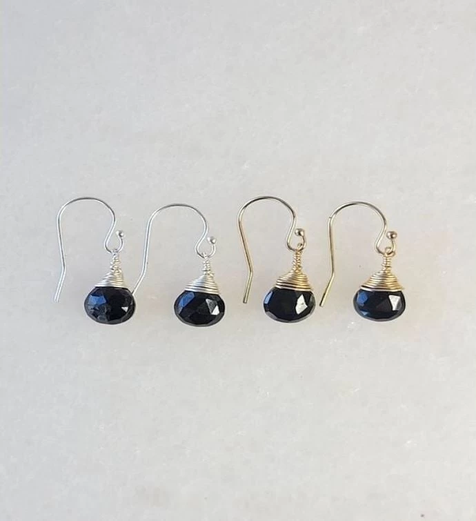 A Blonde and Her Bag. Jill Short Drop Earring in Black Onyx. Dangle earring with black onyx stone drop hand-wrapped in your choice of either 14k gold fill or sterling silver.