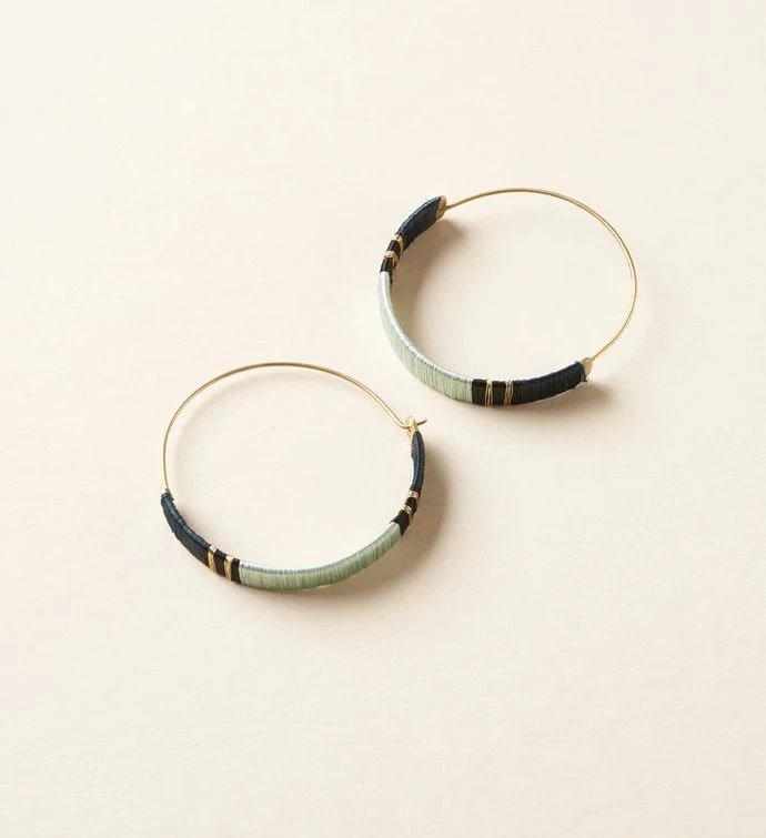 Handcrafted hoop earrings feature blue tone and metallic gold thread wrapping and clean wire setting with gold finish.