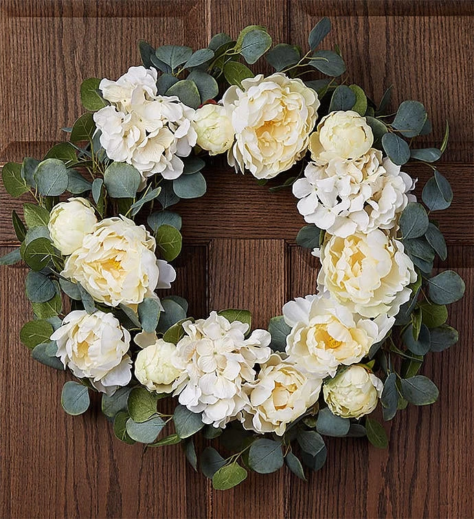 - Wreath is crafted from faux white hydrangeas, peonies and eucalyptus on a twig base