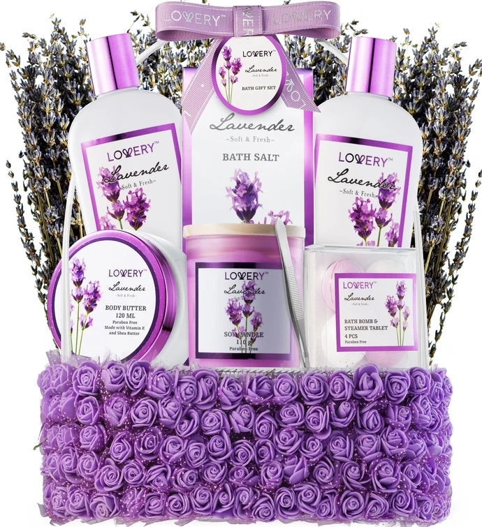 Gifts for Her, Bath and Body Gift Basket for Women, Spa Gift Baskets for Women, Lavender Spa Kit, Bubble Bath, Bath Bomb, Shower Steamer, 3 Wick Candle & More, Self Care Gifts for Women