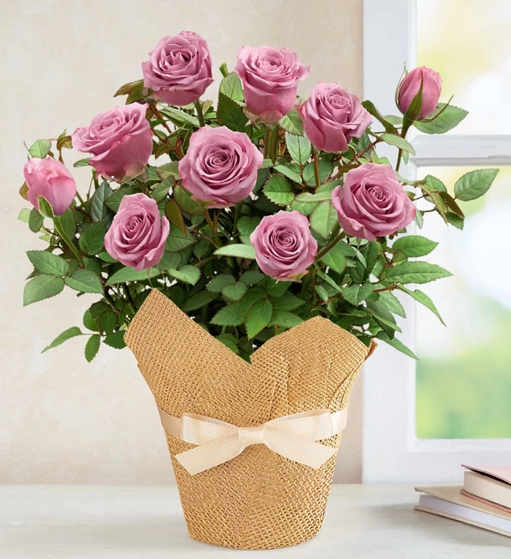 Our lovely rose plant arrives budding and ready to reveal sweet purple blooms. Designed in our exclusive, naturally woven wrap, it’s sure to delight the people you love, while brightening up the home or garden.
