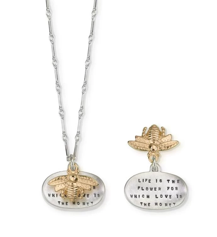 This necklace was inspired by my dear 14 yr old environmentalist daughter. We are both huge bee lovers as well as protectors. Any time she comes across one in a pool or puddle she gently gets it to safety. Another reason for designing this necklace is because bees are at risk of late and without them, there will be no more of the fruits and veggies that provide us with the very nutrients that sustain us. It’s hard to imagine a world without them. So the more attention the bees get these days…. the better.
