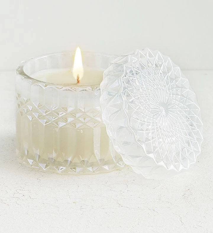 - Coordinating scented candle with white & gold design and dried flowers on lid