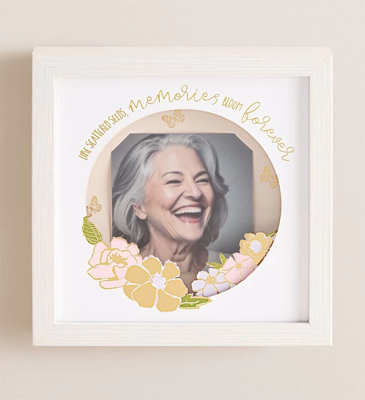 - Features gold floral & butterfly design, white frame and the sentiment: “Like scattered seeds, memories bloom forever”