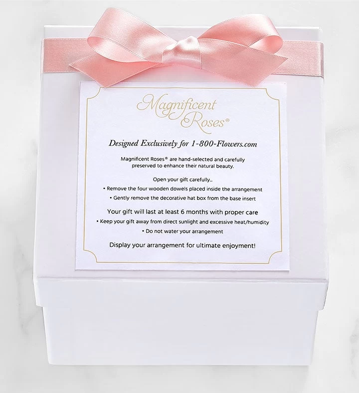 - Roses and hat box arrive in a decorative gift box with coordinating pink ribbon