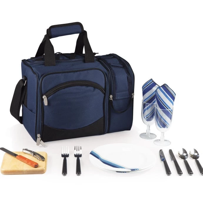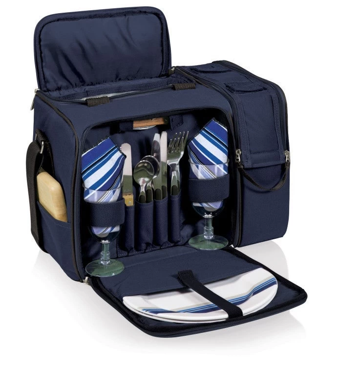 Take the Malibu Cooler Picnic Basket portable soft sided cooler with picnic set for 2 along on your next outdoor adventure, enjoying all the practical benefits of a conventional picnic basket with a sleek, modern flair. Blending high portability, rugged design, and modern style with its polyester microfiber construction and insulated cooler section with deluxe picnic basket for two. A separate insulated, two-bottle beverage section has a padded divider and peek-through closures for tall bottles. This 12 can beverage capacity picnic cooler has a water-resistant liner for easy cleaning and the front section securely holds plates, tumblers, stainless steel silverware and a waiter-style corkscrew, a hardwood cutting board and cheese knife, and 100% cotton napkins.