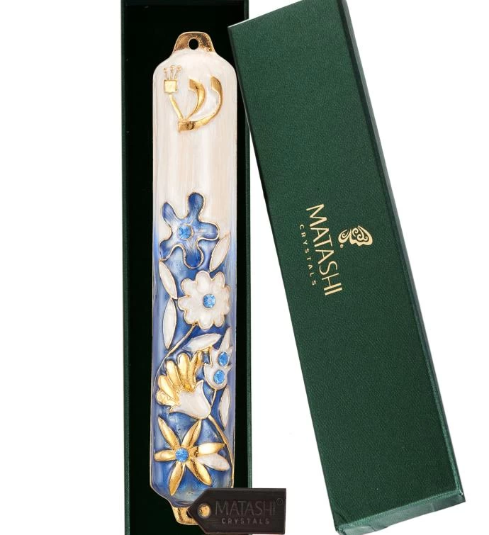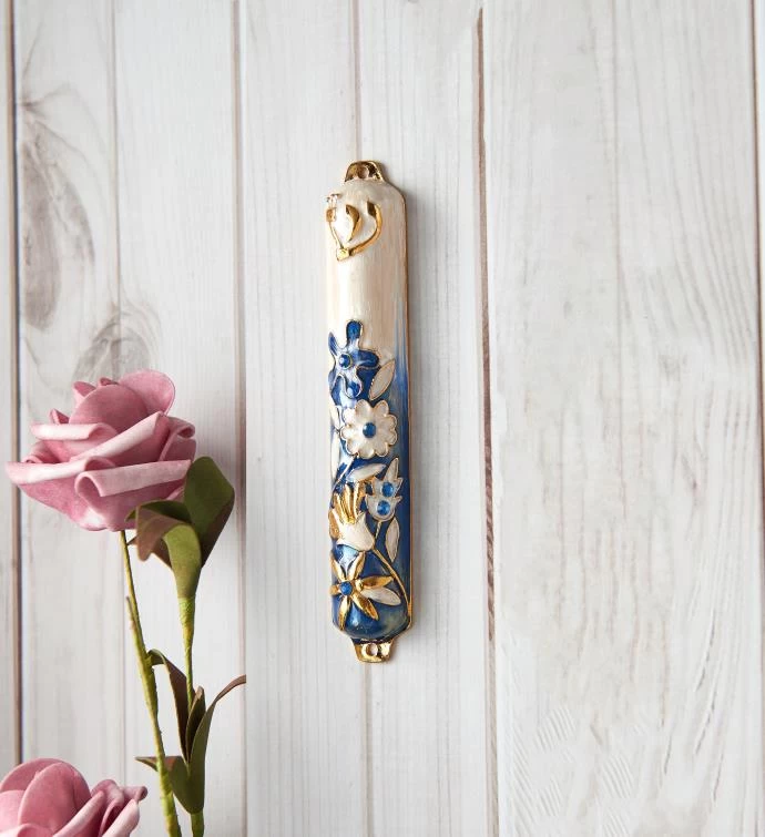 Hand Painted Blue and Ivory Enamel Flower Mezuzah