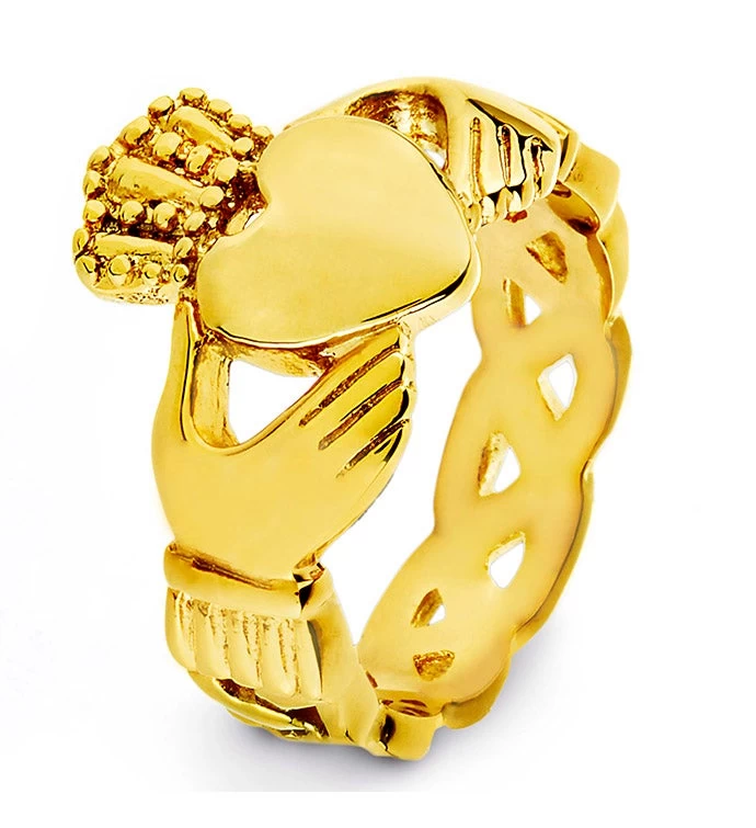 Traditional Claddagh design with a Celtic Knot band highlights this gold plated stainless steel ring. The Heart represents Love, the Hands represent friendship and the Crown represent Loyalty.