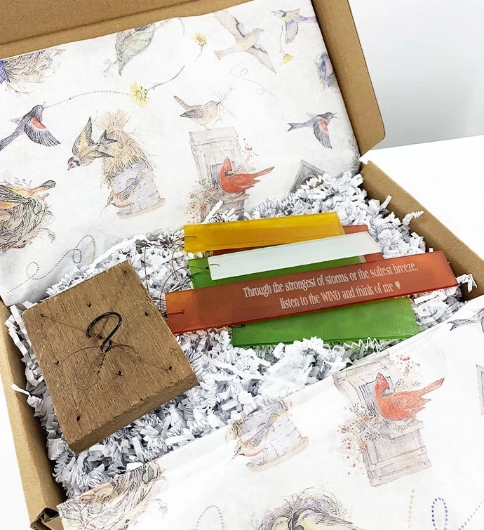 Chime reads “Through the strongest storms or softest breeze listen to the wind and think of me.” Created from thick glass these prisms measure 8 inches each. Soft, soothing and airy sound.